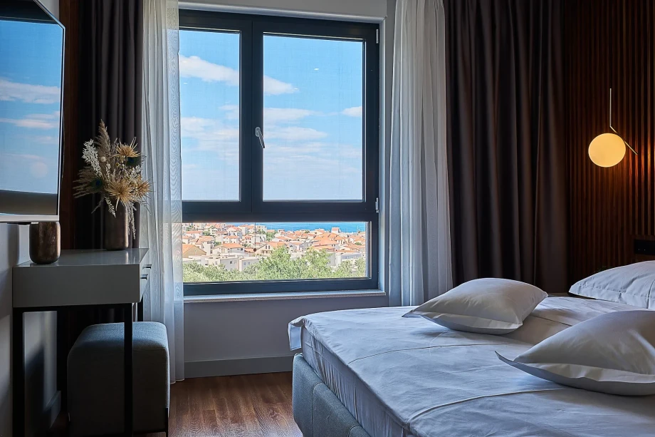 On the mezanine you’ll find master bedroom and another double bedroom, all with ensuite bathroom. Beacuse of it positions, rooms have different views - mountain, pool, city of Split, Podstrana and one bedroom has own balcony. With a more subtle elegance to their style, these rooms offer a relaxing atmosphere for unwinding in privacy after a day of doing as much or as little as you please together.